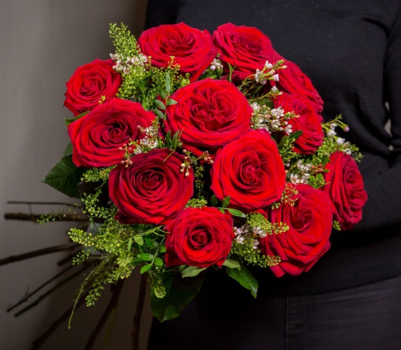12 Stunning roses hand-tied with seasonal foliage