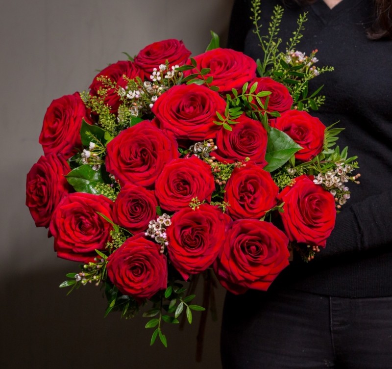 18 Stunning red roses hand-tied with wax flowers & seasonal foliage