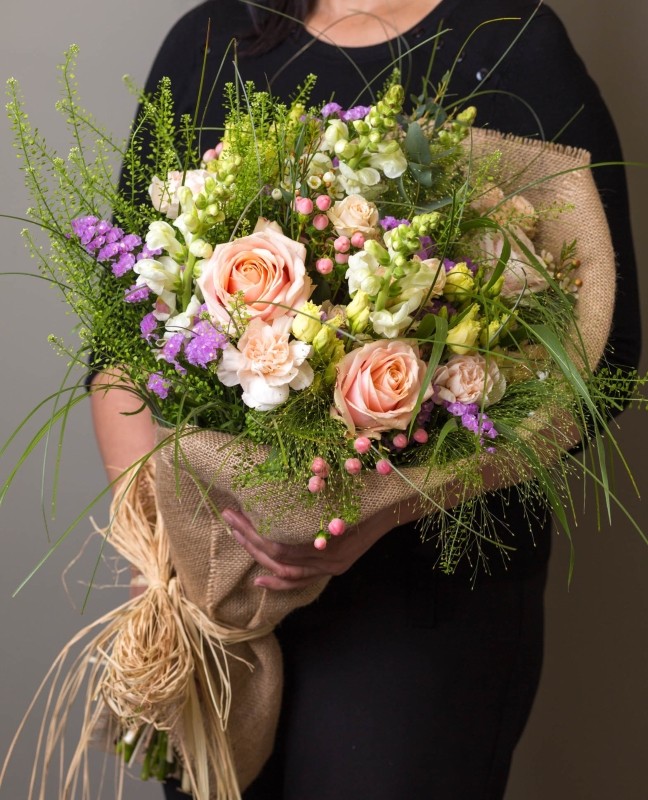 An Eco friendly bouquet, hand ties and gift wrapped with the stems left lose ready for the recipient to pop into a vase of their choosing at home.