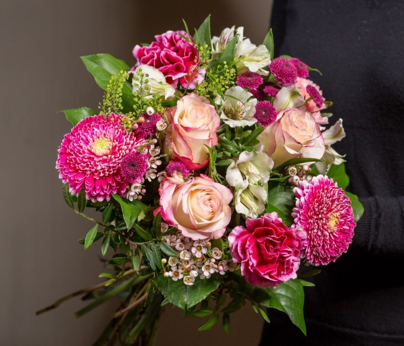 A beautiful bouquet of Roses, Germini, Carnations, Alstromaria & Waxflower Accompanied by the perfect mix of seasonal foliages.