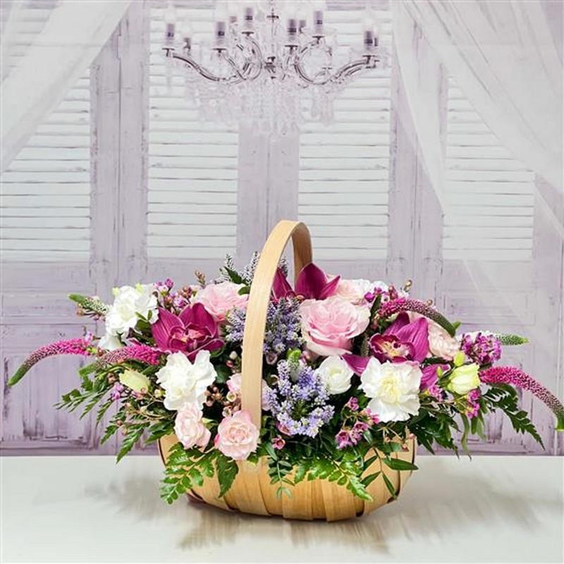 A seasonal basket arrangement of flowers, simply choose your preferred colours and let our florists design a beautiful mix of blooms, using the best of the season. Each design will be one of a kind and image is for inspiration only.