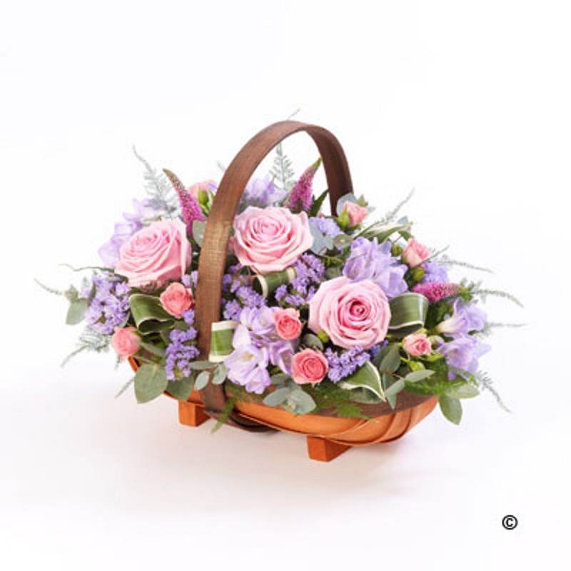 A traditional trug basket filled with roses, veronica, statice and scented freesias in pinks and lilacs.