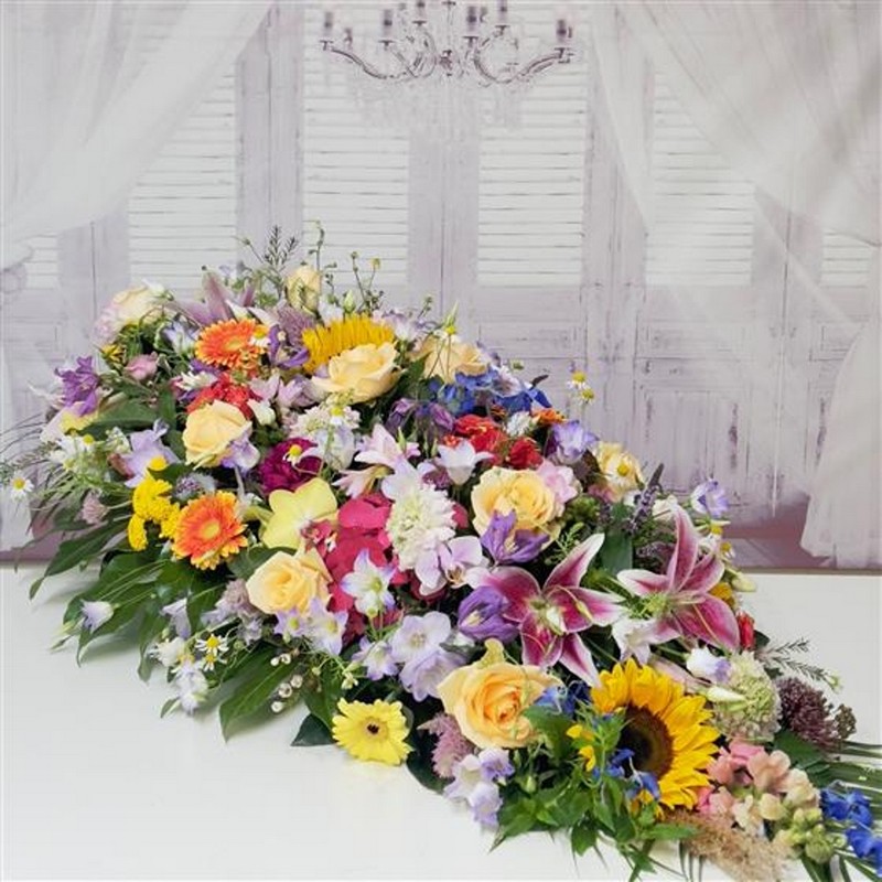 This casket adornment is full of wild garden style flowers, foliages and delicate grasses.
