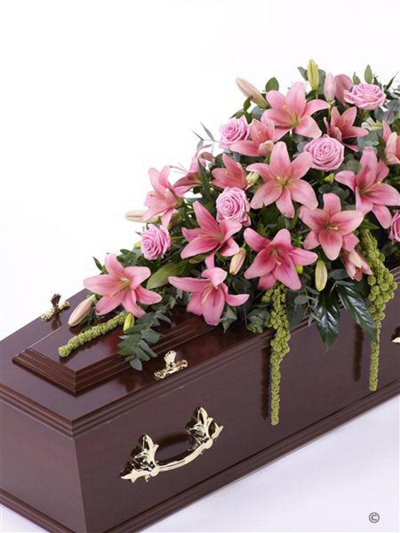 Beautiful Asiatic Lily and large-headed Rose in pretty pink are used to create this elegant casket spray. The fresh flowers are enhanced with trails of green amaranthus as well as ruscus, aralia leaves and eucalyptus.
