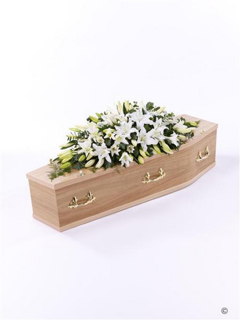 A blanket of white Oriental Lily is beautifully complemented by an array of luxurious deep green leaves to create this simple but striking casket spray.