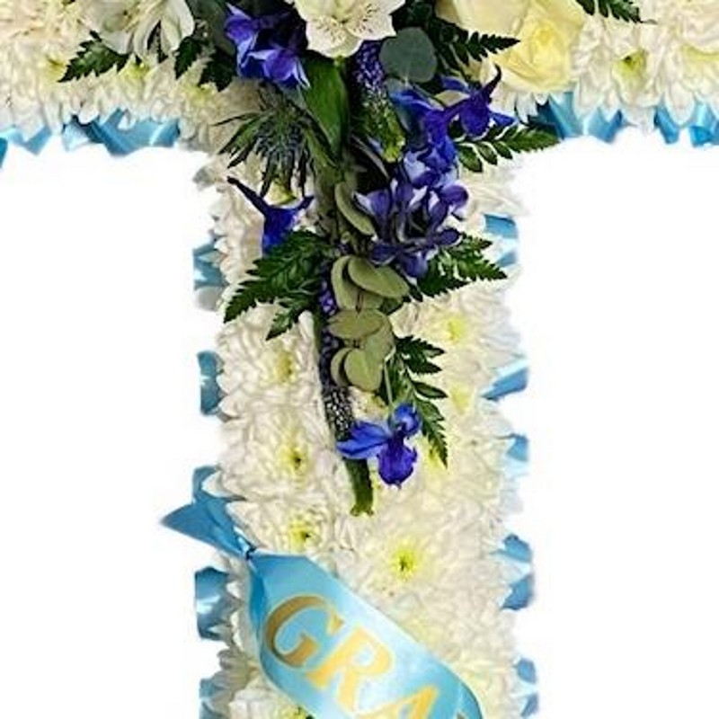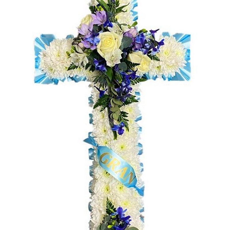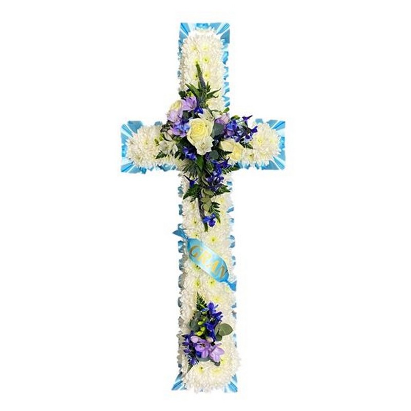 A Classic cross based in white with a colour choice of flowers and complimentary ribbon edge. Wording can be added by request. This item does not come with a sash & wording as standard. 3ft (92sm) = Standard price 4ft (130am) = Large price 5ft (160cm) = Deluxe price