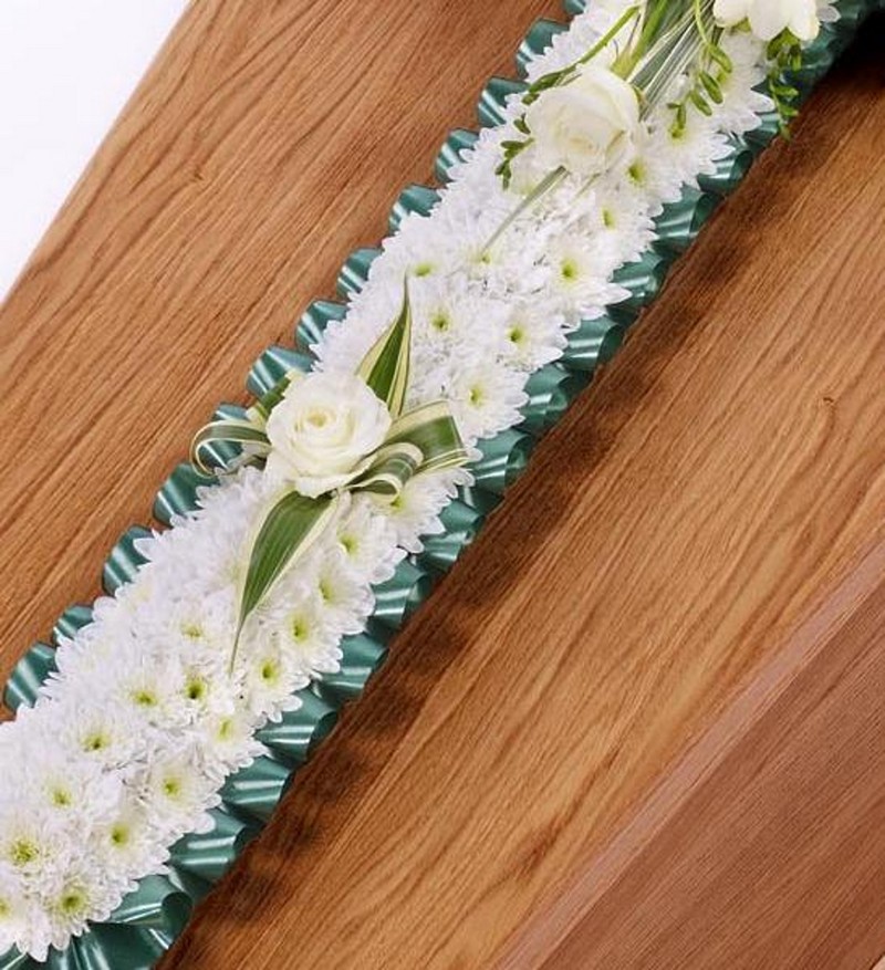 This classic cross is covered with a mass of white Spray Chrysanthemums. A spray of white roses, white freesias and dracaena leaves completes this traditional design.