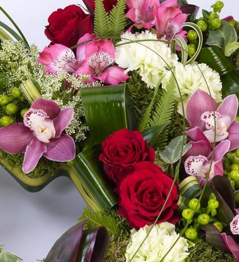 Mini cymbidium orchids, carnations, alstroemeria, short-Stem roses and hypericum in coordinating shades of pink, red, cream and green are nestled into two open heart shapes. Loops of steel grass complete this elegant design.
