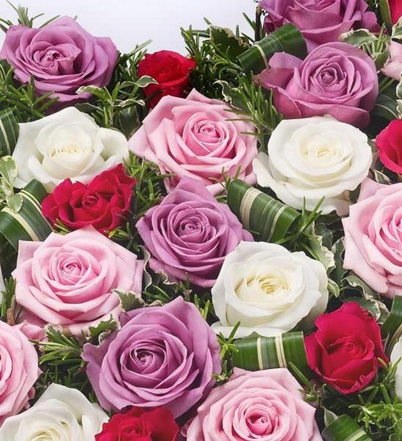 Large-headed roses in lilac, red and white and short-Stem roses in pink are nestled into an solid heart shape amongst dracaena and rosemary.