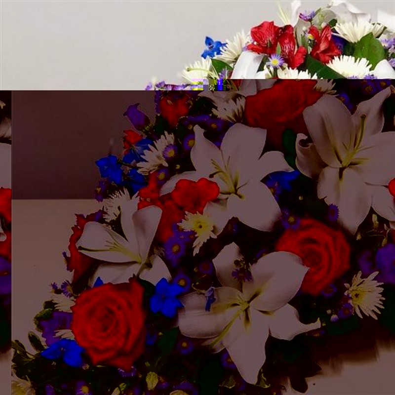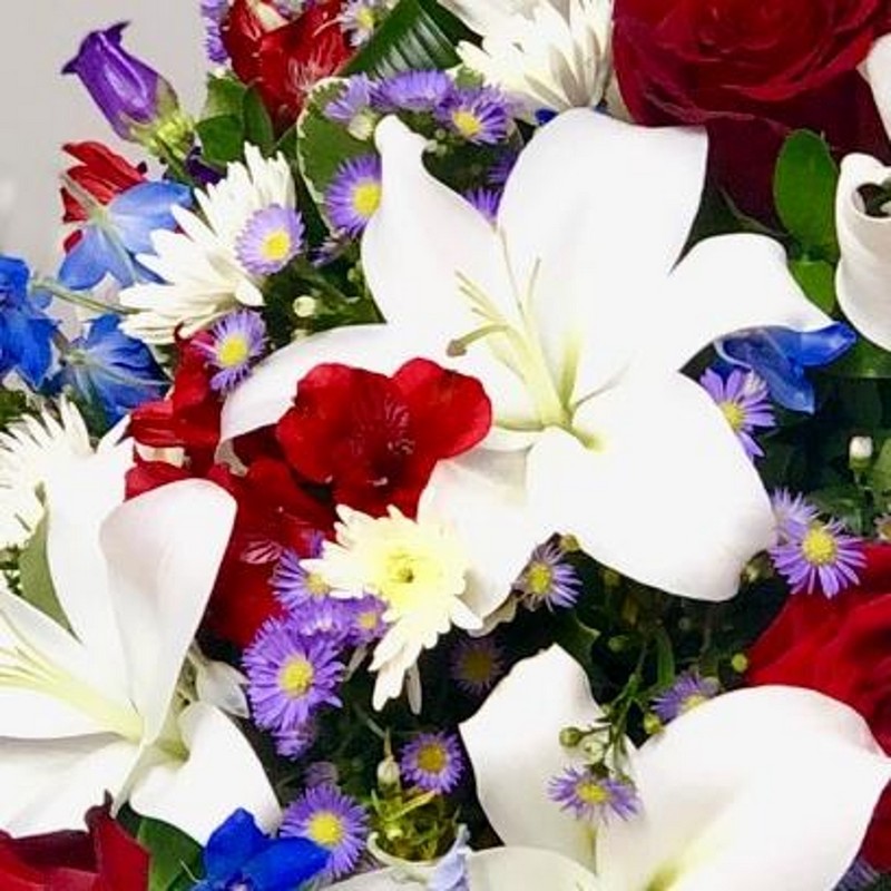A classic single ended spray in Red White and Blue. Includes White Lilies & Red roses with seasonal blue & purple flowers. Standard - min 65cm Medium - min 80cm Large - min 95cm Picture shows large size arrangement