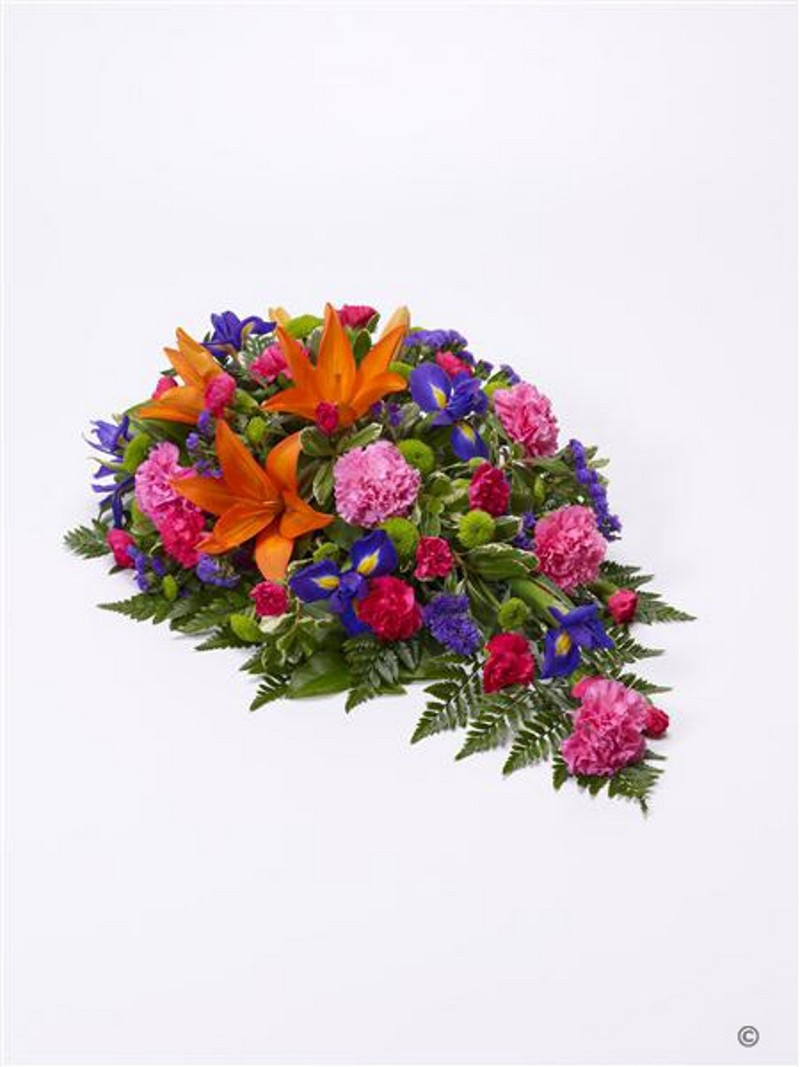 Asiatic Lily and carnations are presented with irises, spray carnations and choice foliage to create this vibrant teardrop spray.