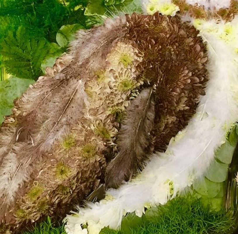 A funeral tribute in the form of a Barn Owl, this beautiful bird comes on a 2ft x 2ft designer board and can be decorated with seasonal woodland foliages, feathers and expertly coloured chrysanthemums. This tribute can be made as any bird of your choice by request.