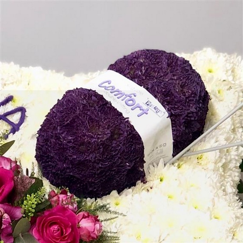 A perfect funeral tribute for someone that loved to knit. This item can be made in any colour on request. This bespoke tribute is made and designed by our team at Old Oak Floral Designers Ascot.
