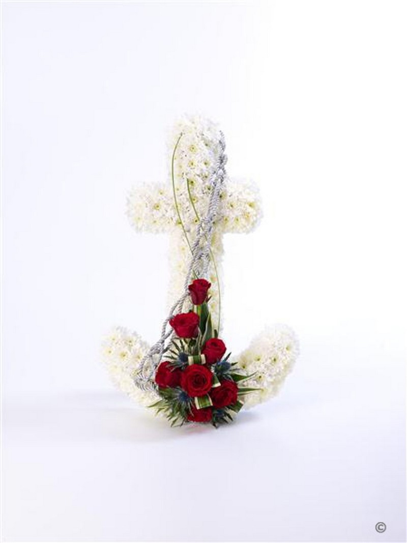 An anchor shaped design using a mass of white double spray chrysanthemums with a feature spray of red short Stem roses and a contrasting blue eryngium. The tribute is finished with green foliage and a silver cord.