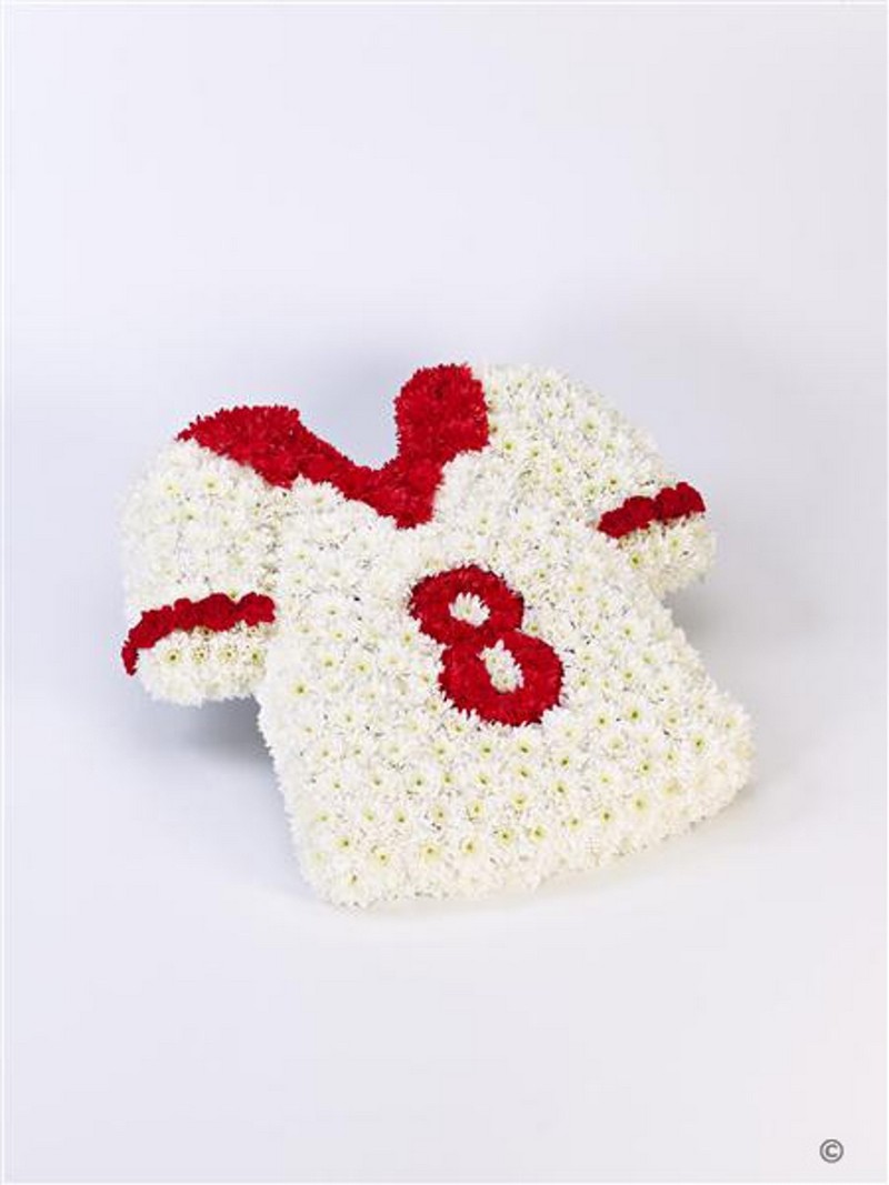 Double spray chrysanthemums and spray carnations are used to create this red and white football shirt design. We can make any team's shirt by request. Badges & Logo's will be printed, laminated for protection from the weather and placed appropriately.
