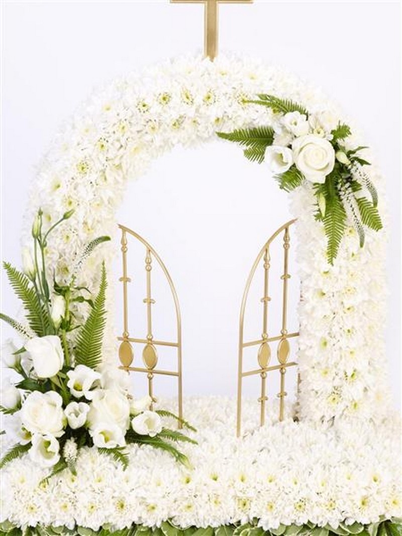 This design is created using white double spray chrysanthemums and finished with sprays of lisianthus, roses and veronica in white with contrasting green foliage. This item can be made in any preferred colour choice.