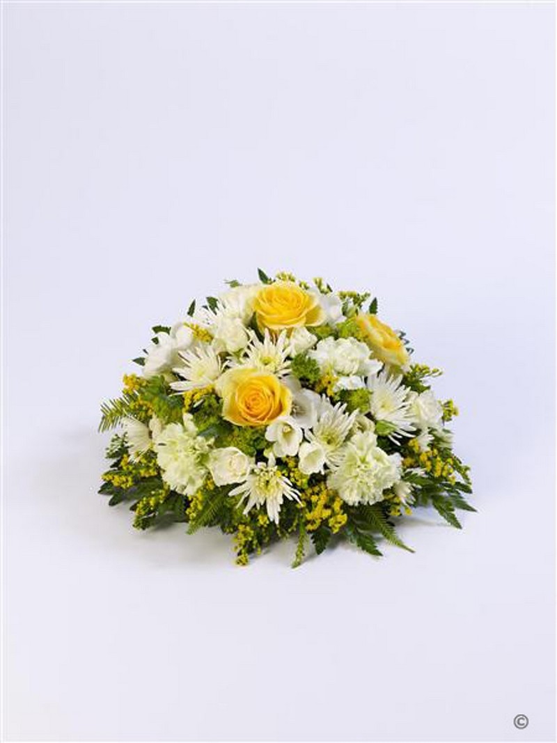 Roses and scented freesia in yellow and white are nestled amongst choice foliage in this classic posy design.