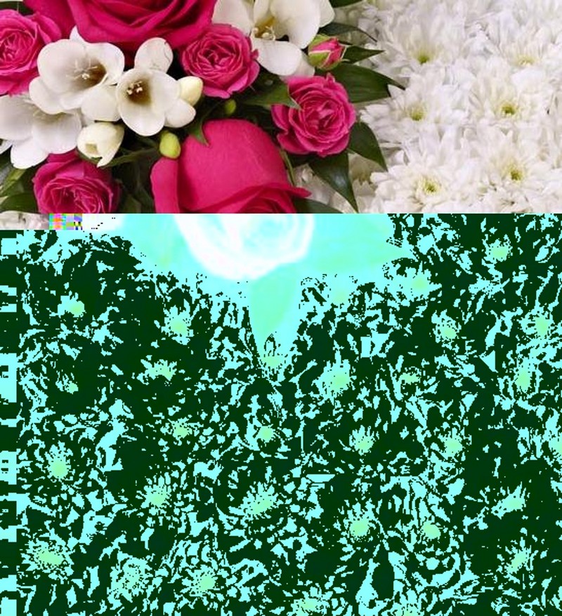 A classic cushion-shaped design created using a mass of white double spray chrysanthemums and finished with a spray of cerise roses and white freesias and a pink ribbon trim.