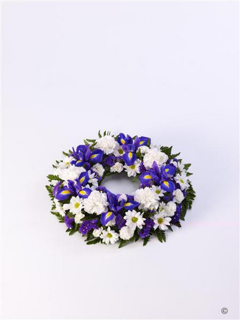 A classic selection of flowers including irises, carnations and spray chrysanthemums in blues and whites are nestled into this traditional circular wreath. Approximate diameter 38cm (14 inches).