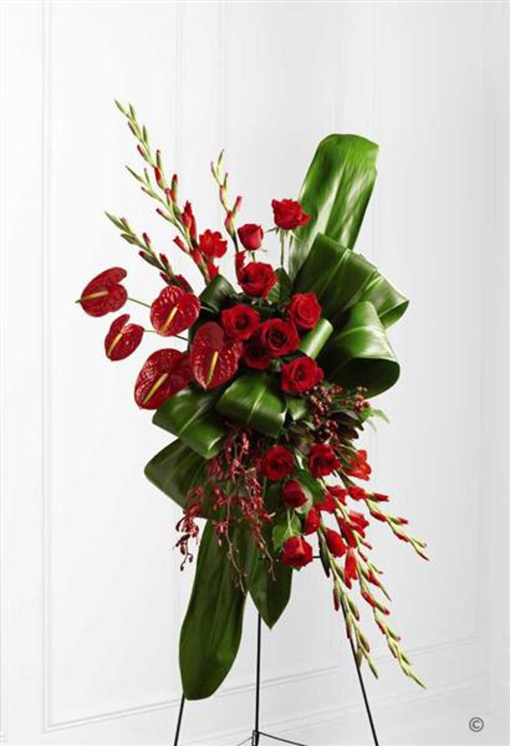 This dramatic standing spray is a real expression of feeling. Brilliant red roses, gladioli, anthurium, aranthera orchids and hypericum berries create an exquisite arrangement offset by bright green folded ti and aspidistra leaves. Displayed on a wire easel.