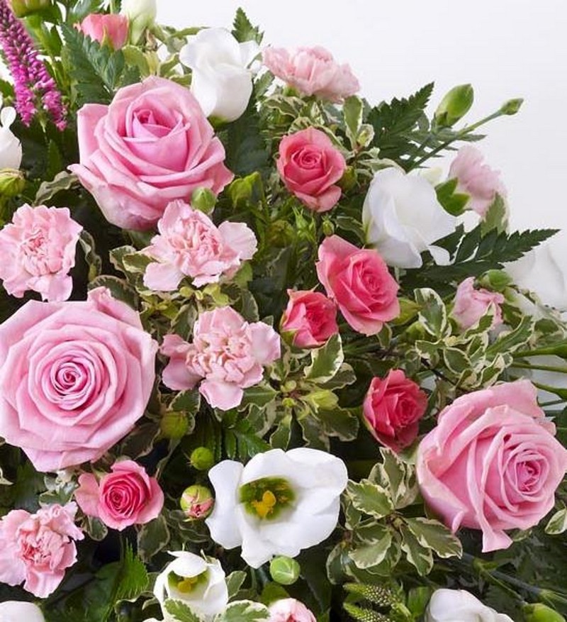 A beautiful tribute for a baby girl, this pretty pink spray features large-headed roses, spray carnations and spray roses in soft pink, interspersed with dark pink Veronica and delicate white lisianthus. It is finished with leather leaf and pittosporum.