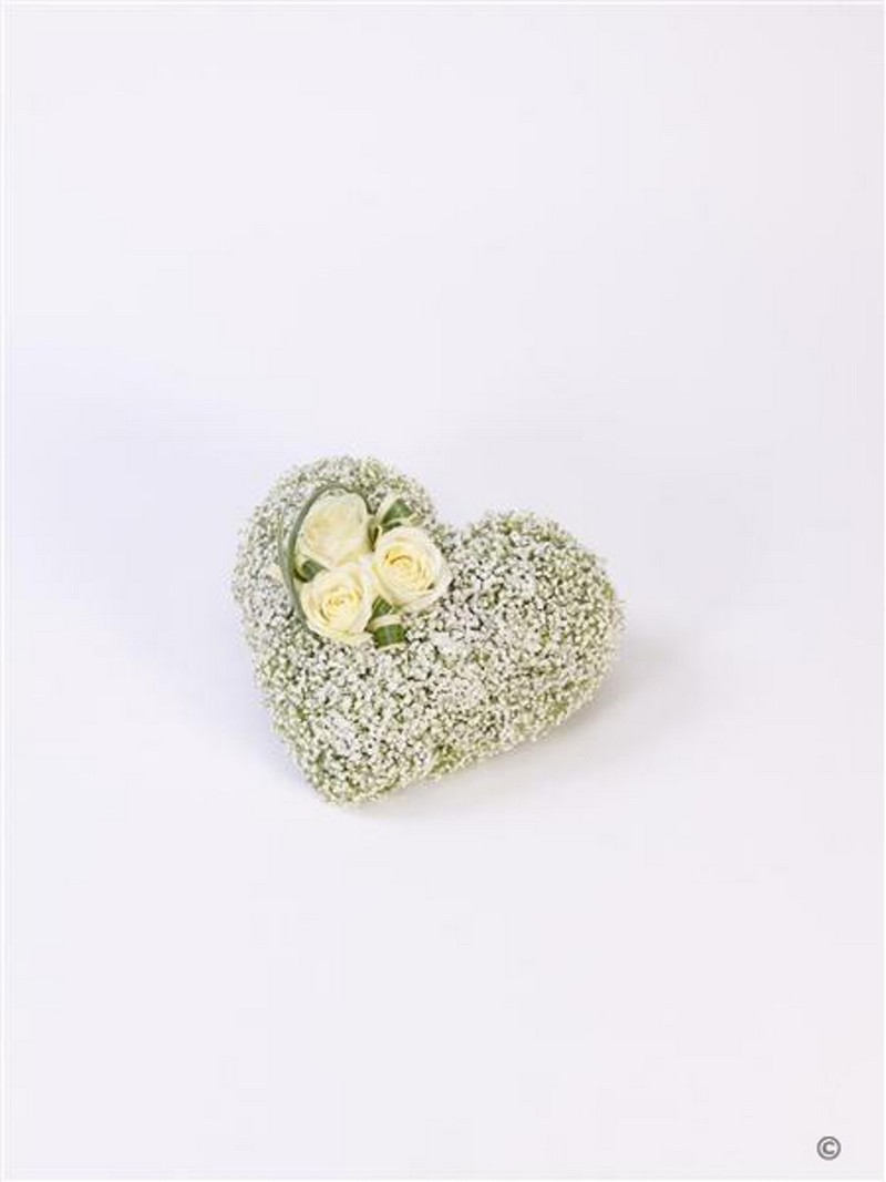 This white heart shaped tribute is a simple and very graceful design. Three perfect cream large-headed roses trimmed with China grass are carefully set on a bed of delicate white gypsophila flowers.