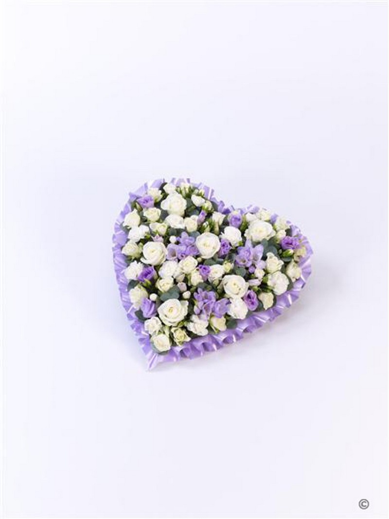 A heart-shaped design in soft pastel lilac and white shades including roses, spray roses, lisianthus, spray carnations and scented freesia.