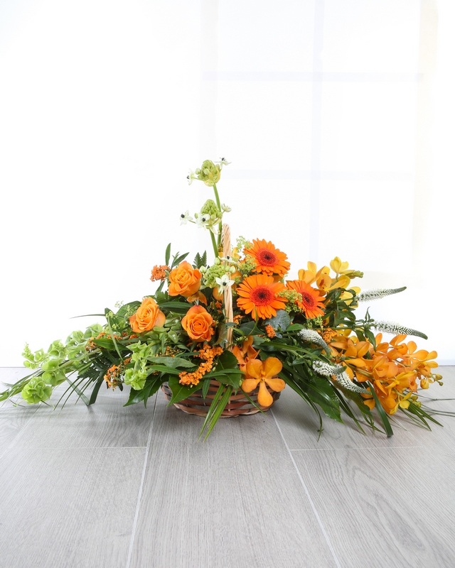 Hera is our bright and beautiful basket, with a modern twist. Vibrant fresh flowers and green foliage are skillfully used to create this gift, and includes favourite blooms Germini, Roses, Orchids, Molucella, Ornithogalum, Veronica and Euphorbia