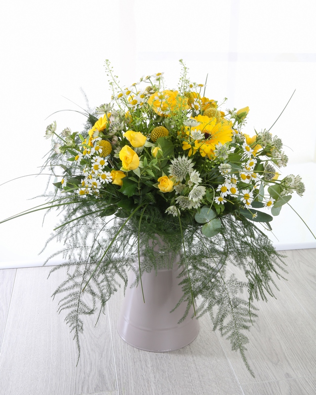 Our Pandora arrangement has an elegant hand-gathered effect, for a natural finish. Carefully created by our skilled florists, Pandora containsa selection of sun coloured flowers including Germini, Roses, Astrantia and Fern.