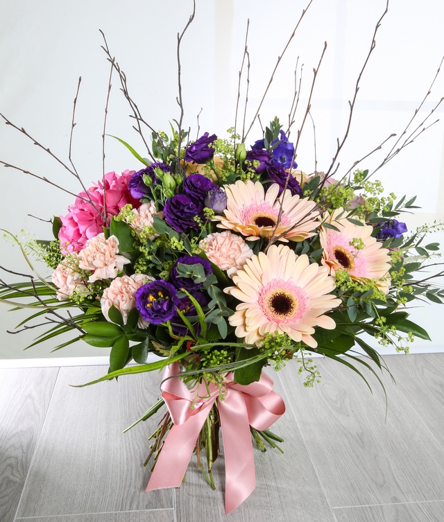 Adelyn is our bright and pretty bouquet. Hand-tied blooms in pinks and purple create a senstional gift, perfect for any special occassion. Including Gerberas, Delphinium, hydrangea and Lisianthus