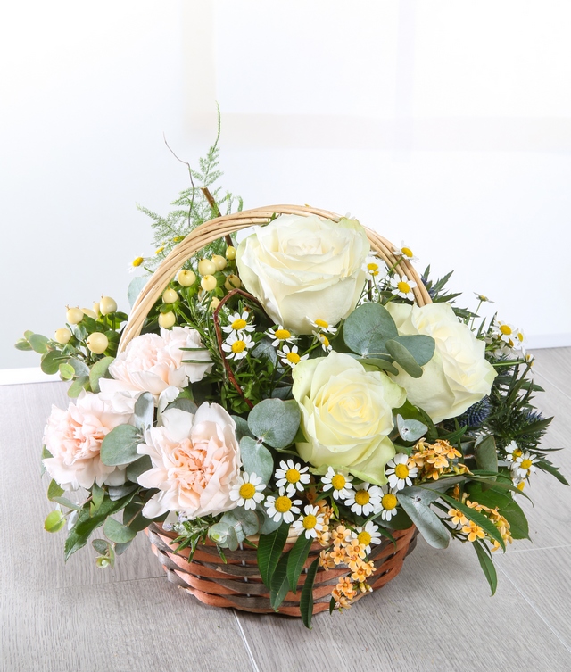 Our woodland themed Jayde basket is perfect for bringing a charming country feel gift. Using classic colours and combination of flowers creates this basket, including Roses, Thistle and Carnations
