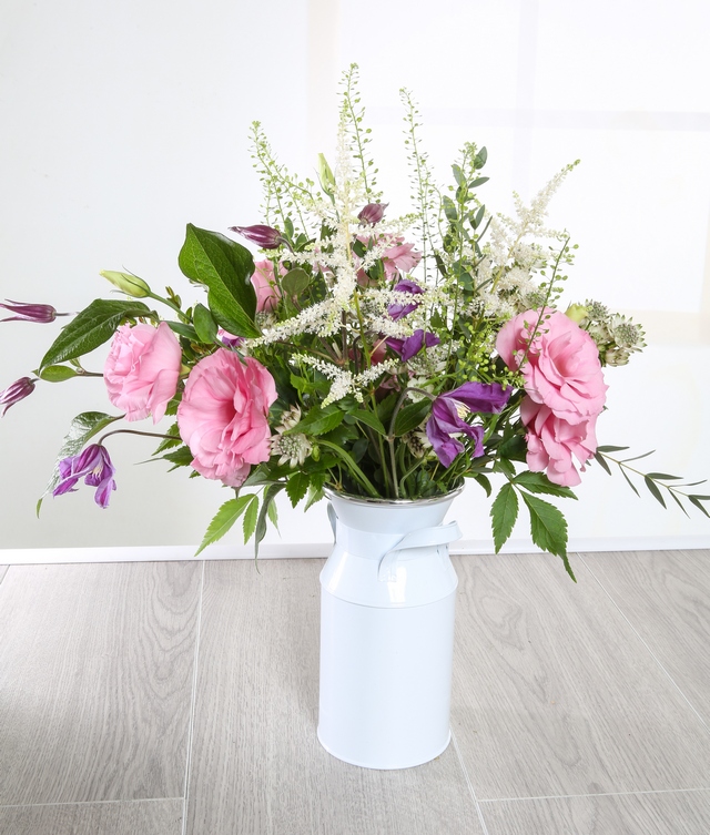 Our beautiful Macaria design is the perfect gift for any special occassion. Fresh blooms of Astilbe, Clematis, Lisianthus and Thlaspi in soft pink, purple and cream tones are skilly presented in a white churn for a modern feel.